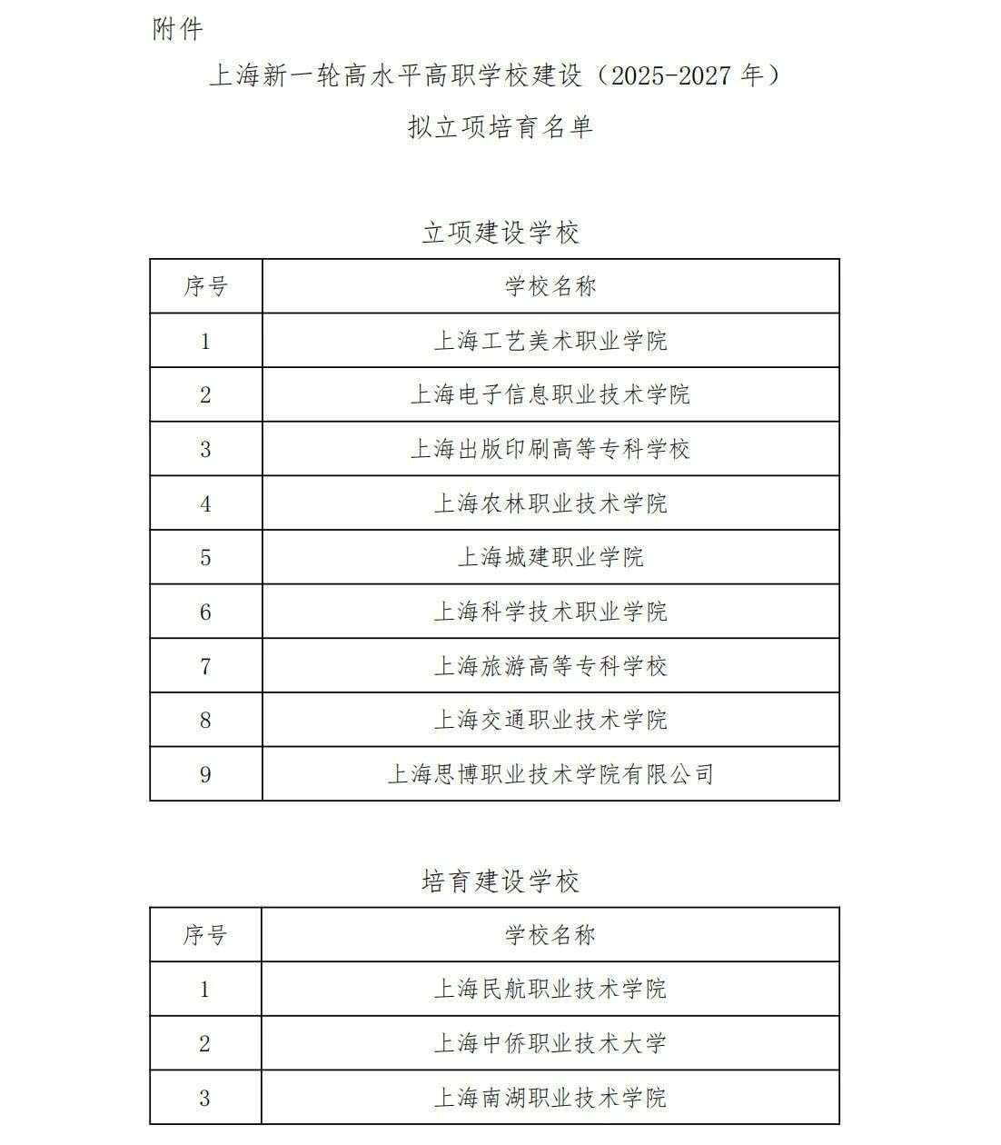 關于上海新一輪高水平高職學校建設(2025-2027年)擬立項培育名單的公示