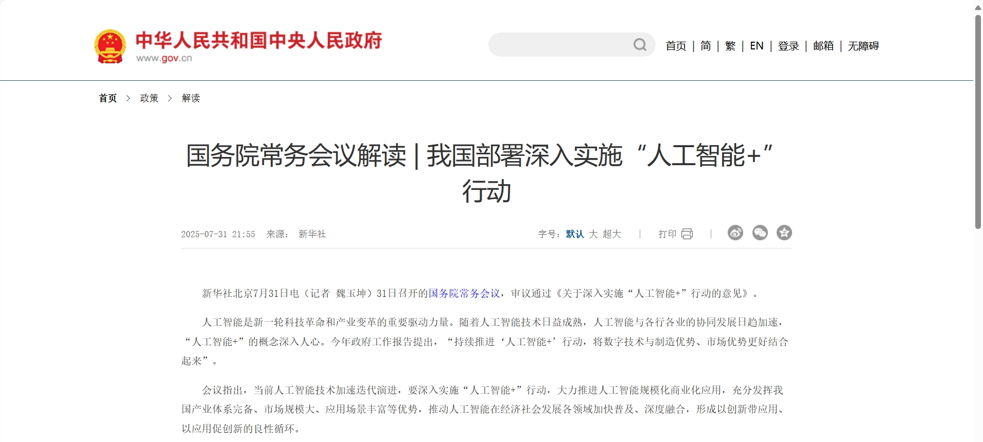 國家戰(zhàn)略高度: 國務院常務會議審議通過,標志著“人工智能+”行動成為國家層面的重要戰(zhàn)略部署。