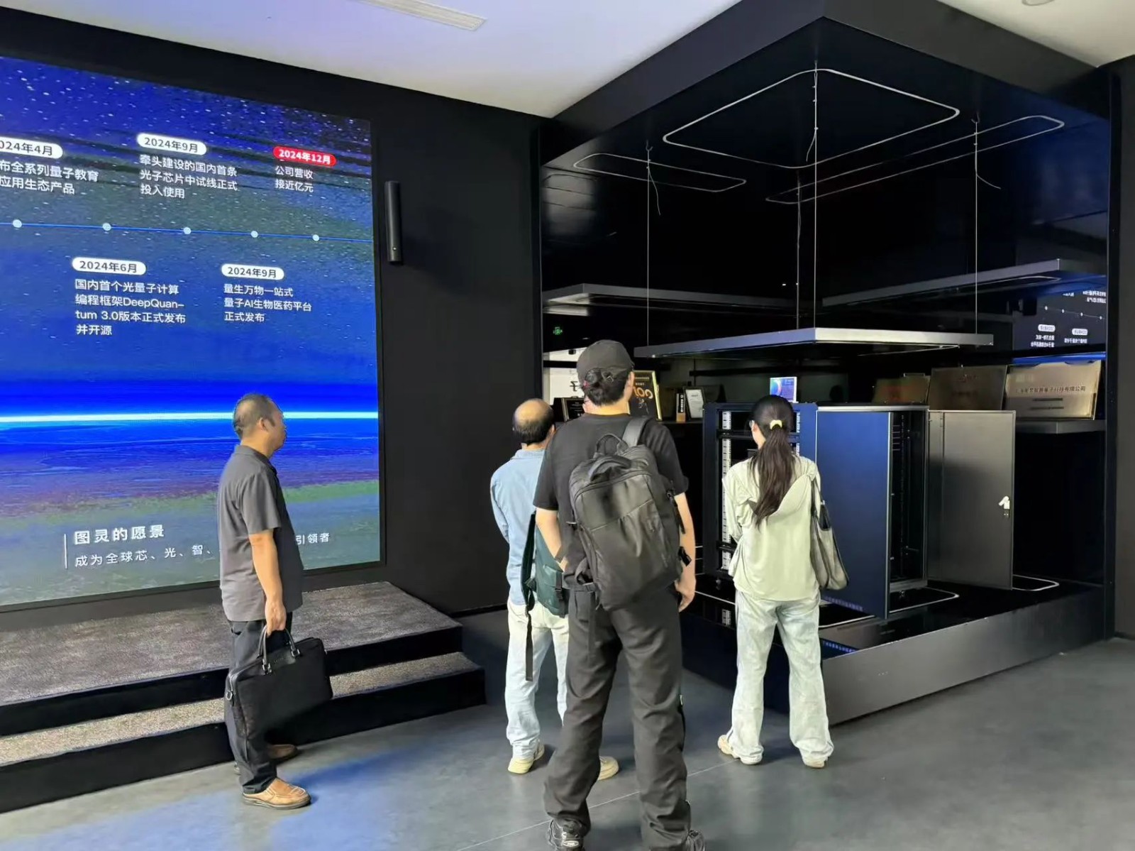 訪問期間,郝瑞成一行參觀了圖靈智算的量子技術展示中心,詳細了解了圖靈智算在量子計算硬件、軟件及算法開發(fā)領域的最新進展和戰(zhàn)略布局。郝總對圖靈智算在推動量子計算技術產(chǎn)業(yè)化方面取得的成就表示贊賞,并介紹了礪城科技在科技信息服務、產(chǎn)教融合以及人才培養(yǎng)生態(tài)構建方面的優(yōu)勢與經(jīng)驗。