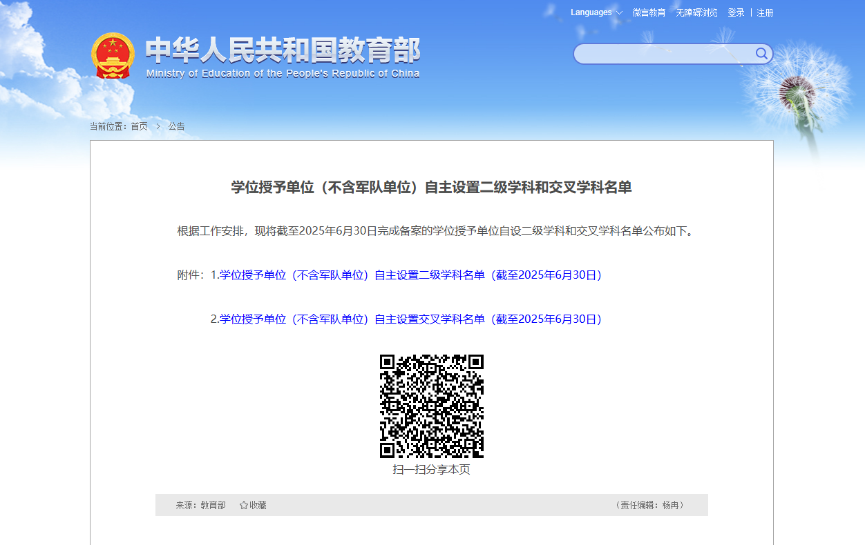 ?2025 年 10 月 11 日,教育部在官網(wǎng)發(fā)布重要通知,正式公布截至 2025 年 6 月 30 日完成備案的 “學(xué)位授予單位(不含軍隊(duì)單位)自主設(shè)置二級(jí)學(xué)科和交叉學(xué)科名單”,為高校學(xué)科建設(shè)、學(xué)生升學(xué)選擇及行業(yè)人才培養(yǎng)提供明確政策依據(jù)。