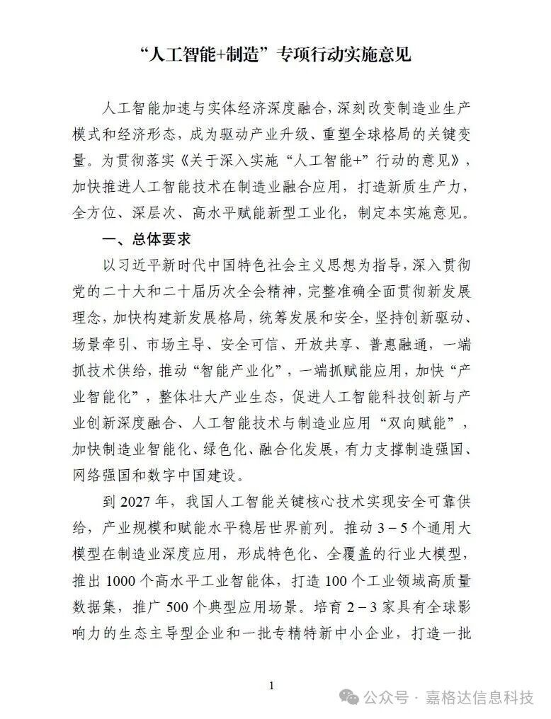八部門關(guān)于印發(fā)《“人工智能+制造”專項行動實施意見》的通知